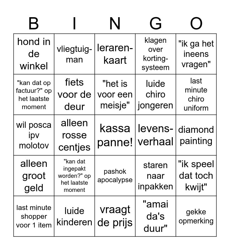 This bingo card has a free space and 24 words: "kan dat ingepakt worden?" op het laatste moment, luide kinderen, "het is voor een meisje", last minute shopper voor 1 item, "ik ga het ineens vragen", hond in de winkel, "kan dat op factuur?" op het laatste moment, vliegtuig-man, levens- verhaal, pashok apocalypse, luide chiro jongeren, wil posca ipv molotov, staren naar inpakken, "ik speel dat toch kwijt", fiets voor de deur, "amai da's duur", diamond painting, leraren-kaart, last minute chiro uniform, alleen rosse centjes, gekke opmerking, alleen groot geld, klagen over korting-systeem and vraagt de prijs.
