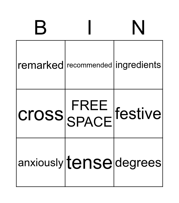 This bingo card has a free space and 8 words: festive, ingredients, recommended, anxiously, remarked, degrees, cross and tense.