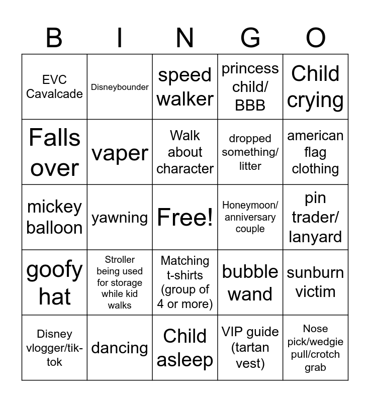 This bingo card has a free space and 25 words: Stroller being used for storage while kid walks, Child asleep, Walk about character, Disney vlogger/tik-tok, Child crying, EVC Cavalcade, Falls over, Disneybounder, Honeymoon/ anniversary couple, Matching t-shirts (group of 4 or more), dropped something/ litter, mickey balloon, bubble wand, sunburn victim, vaper, Specialty popcorn bucket, pin trader/ lanyard, speed walker, american flag clothing, yawning, Nose pick/wedgie pull/crotch grab, dancing, goofy hat, princess child/ BBB and VIP guide (tartan vest).