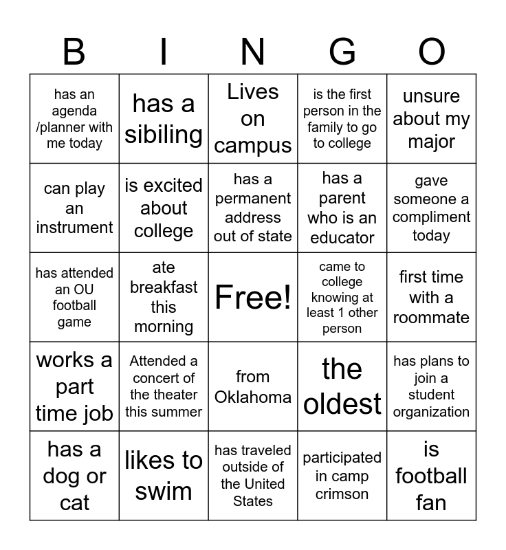This bingo card has a free space and 24 words: Attended a concert of the theater this summer, likes to swim, has a permanent address out of state, has a dog or cat, unsure about my major, has an agenda /planner with me today, can play an instrument, has a sibiling, came to college knowing at least 1 other person, from Oklahoma, has a parent who is an educator, has attended an OU football game, the oldest, has plans to join a student organization, is excited about college, participated in camp crimson, first time with a roommate, Lives on campus, gave someone a compliment today, ate breakfast this morning, is football fan, works a part time job, is the first person in the family to go to college and has traveled outside of the United States.
