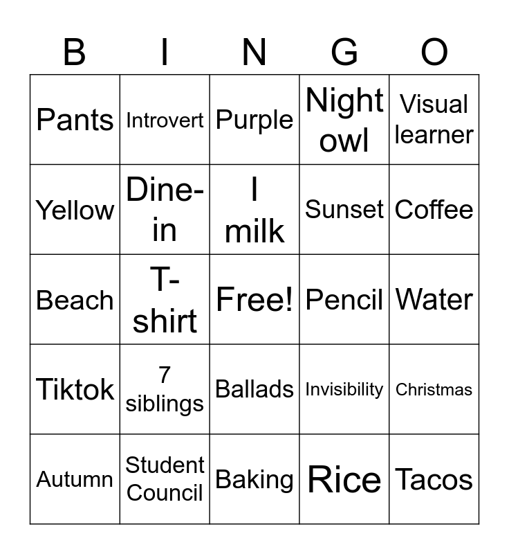 This bingo card has a free space and 24 words: 7 siblings, Student Council, I milk, Autumn, Visual learner, Pants, Yellow, Introvert, Pencil, Ballads, Sunset, Beach, Invisibility, Christmas, Dine-in, Rice, Water, Purple, Coffee, T- shirt, Tacos, Tiktok, Night owl and Baking.