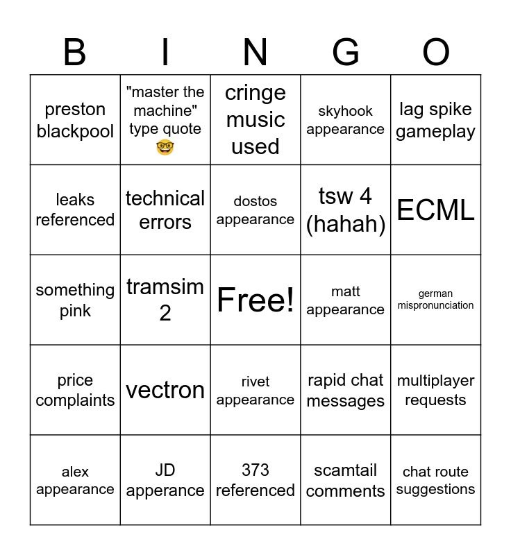 This bingo card has a free space and 24 words: vectron, JD apperance, dostos appearance, alex appearance, lag spike gameplay, preston blackpool, leaks referenced, "master the machine" type quote 🤓, matt appearance, rivet appearance, tsw 4 (hahah), something pink, rapid chat messages, multiplayer requests, technical errors, scamtail comments, german mispronunciation, cringe music used, ECML, tramsim 2, chat route suggestions, price complaints, skyhook appearance and 373 referenced.
