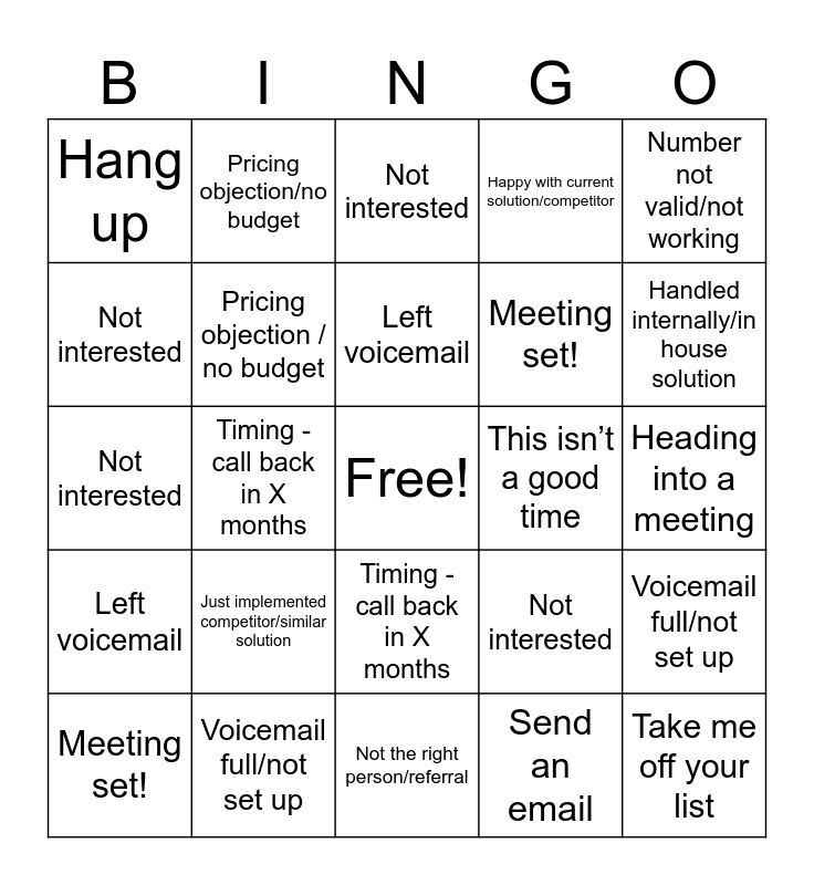 This bingo card has a free space and 45 words: How’d you get this number?, Take me off your list, Hang up, Meeting set!, Heading into a meeting, Send an email, Not interested, Left voicemail, Number not valid/not working, Voicemail full/not set up, Happy with current solution/competitor, This isn’t a good time, Timing - call back in X months, Just implemented competitor/similar solution, Left message w/ Gatekeeper, Not the right person/referral, Left voicemail, Not interested, Meeting set!, Handled internally/in house solution, Pricing objection/no budget, How’d you get this number?, Take me off your list, Hang up, Meeting set!, Heading into a meeting, No answer but definitely wrong number, Send an email, Not interested, Left voicemail, Number not valid/not working, Voicemail full/not set up, Happy with current solution/competitor, This isn’t a good time, Prospect busy, Timing - call back in X months, Just implemented competitor/similar solution, Left message w/ Gatekeeper, Not the right person / referral, Left voicemail, Not interested, Meeting set!, Handled internally/in house solution, Pricing objection / no budget and Connect - wrong number.