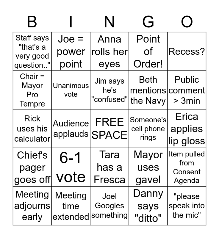This bingo card has a free space and 27 words: Mayor uses gavel, Steve Powers to the rescue!, Beth mentions the Navy, Joel Googles something, Chair = Mayor Pro Tempre, Anna rolls her eyes, Joe = power point, Chief's pager goes off, Someone's cell phone rings, Item pulled from Consent Agenda, Rick uses his calculator, Point of Order!, Meeting adjourns early, Meeting time extended, Public comment > 3min, Mayor = tiebreaking vote, Unanimous vote, Jim says he's "confused", 6-1 vote, Staff says "that's a very good question..", Erica applies lip gloss, Danny says "ditto", Audience applauds, "please speak into the mic", Tara has a Fresca, Recess? and Agenda gets changed.