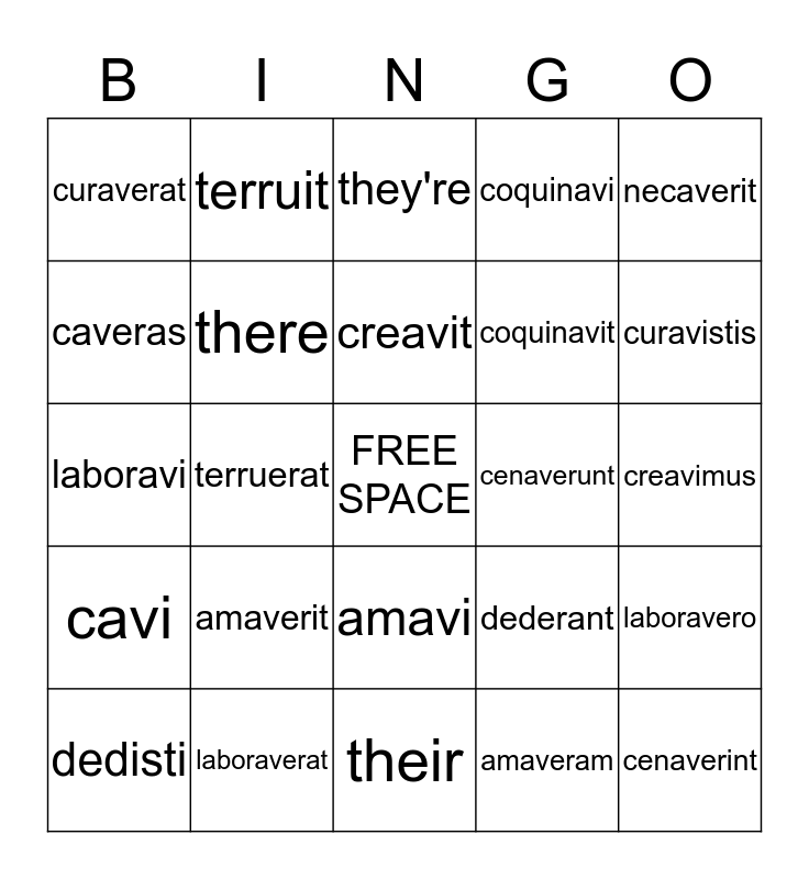 This bingo card has a free space and 24 words: amaverit, laboraverat, creavit, dedisti, necaverit, curaverat, caveras, terruit, cenaverunt, amavi, coquinavit, laboravi, dederant, laboravero, there, amaveram, creavimus, they're, curavistis, terruerat, cenaverint, cavi, coquinavi and their.
