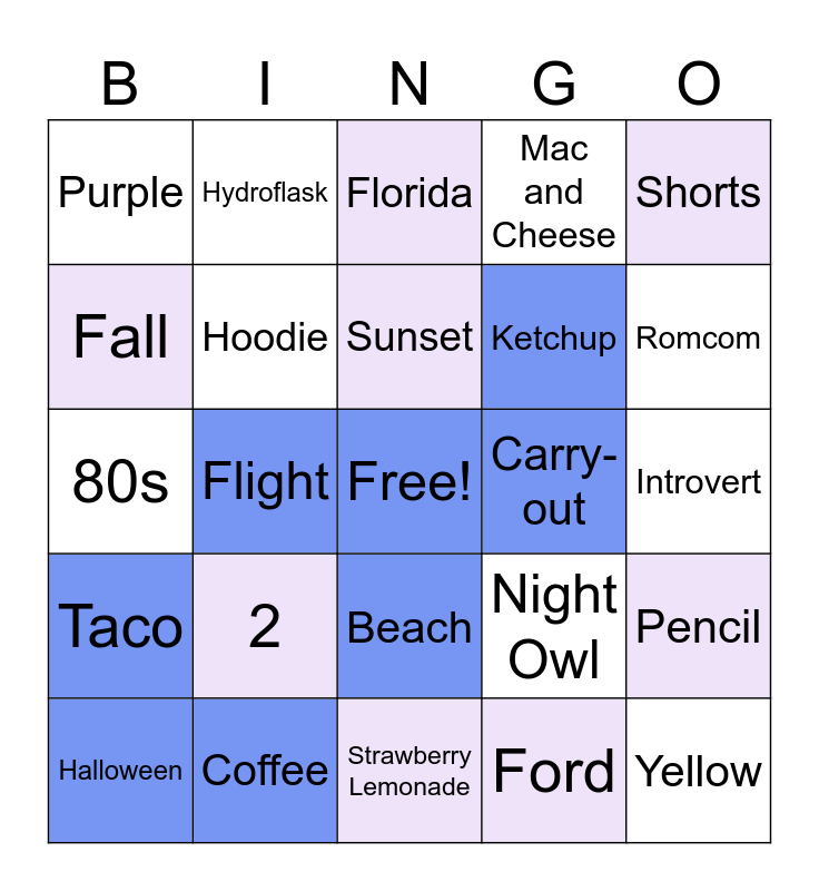 This bingo card has a free space and 24 words: 2, Coffee, Sunset, Halloween, Shorts, Purple, Fall, Hydroflask, Carry-out, Beach, Ketchup, 80s, Night Owl, Pencil, Hoodie, Ford, Introvert, Florida, Romcom, Flight, Yellow, Taco, Mac and Cheese and Strawberry Lemonade.