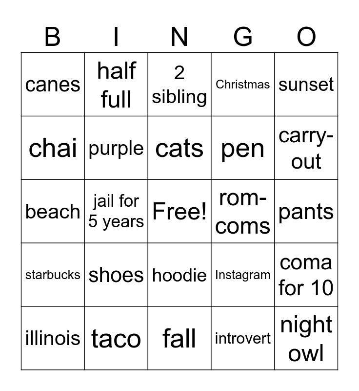 This bingo card has a free space and 24 words: shoes, taco, cats, illinois, sunset, canes, chai, half full, rom-coms, hoodie, pen, beach, Instagram, coma for 10, purple, introvert, pants, 2 sibling, carry-out, jail for 5 years, night owl, starbucks, Christmas and fall.