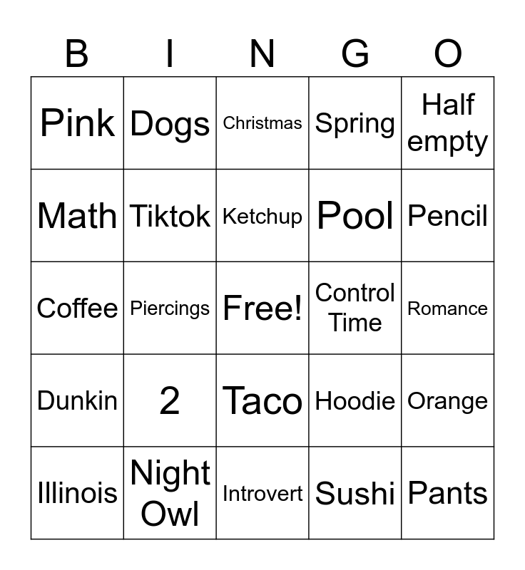 This bingo card has a free space and 24 words: 2, Night Owl, Ketchup, Illinois, Half empty, Pink, Math, Dogs, Control Time, Taco, Pool, Coffee, Hoodie, Orange, Tiktok, Sushi, Romance, Christmas, Pencil, Piercings, Pants, Dunkin, Spring and Introvert.