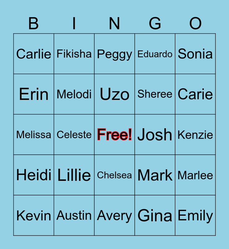 This bingo card has a free space and 32 words: Ashlee, Austin, Avery, Beth, Carie, Carlie, Celeste, Chelsea, Eduardo, Emily, Erin, Fikisha, Gina, Heather, Heidi, Jennifer, Jordan, Josh, Kenzie, Kevin, Lillie, Lori, Mark, Marlee, Melissa, Melodi, Peggy, Sheree, Sonia, Terry, Todd and Uzo.
