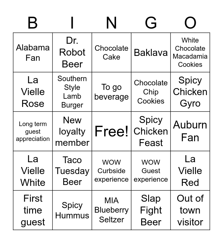 This bingo card has a free space and 24 words: Taco Tuesday Beer, Spicy Hummus, To go beverage, First time guest, White Chocolate Macadamia Cookies, Alabama Fan, La Vielle Rose, Dr. Robot Beer, Spicy Chicken Feast, WOW Curbside experience, Chocolate Chip Cookies, Long term guest appreciation, WOW Guest experience, La Vielle Red, Southern Style Lamb Burger, Slap Fight Beer, Auburn Fan, Chocolate Cake, Spicy Chicken Gyro, New loyalty member, Out of town visitor, La Vielle White, Baklava and MIA Blueberry Seltzer.