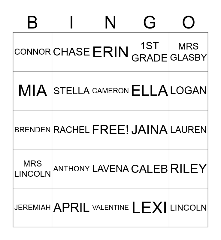 This bingo card has a free space and 24 words: ANTHONY, APRIL, CAMERON, JEREMIAH, MRS GLASBY, CONNOR, MIA, CHASE, JAINA, LAVENA, ELLA, BRENDEN, CALEB, RILEY, STELLA, LEXI, LAUREN, ERIN, LOGAN, RACHEL, LINCOLN, MRS LINCOLN, 1ST GRADE and VALENTINE.