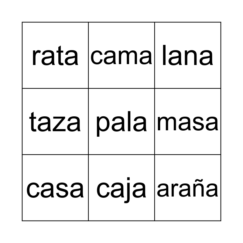 This bingo card has 9 words: casa, lana, cama, taza, rata, masa, pala, araña and caja.