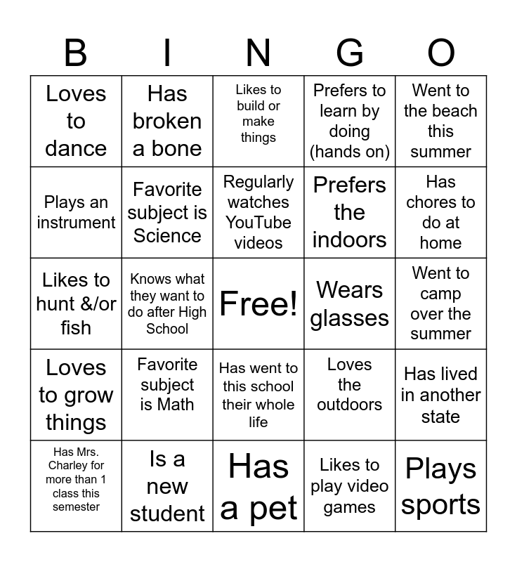 This bingo card has a free space and 26 words: Has went to this school their whole life, Likes to play video games, Regularly watches YouTube videos, Is a new student, Went to the beach this summer, Loves to dance, Plays an instrument, Has broken a bone, Went to camp over the summer, Loves the outdoors, Prefers the indoors, Likes to hunt &/or fish, Has lived in another state, Has Mrs. Charley for more than 1 class this semester, Knows what they want to do after High School, Has never had Mrs. Charley as a teacher before, Prefers to learn by doing (hands on), Loves to grow things, Likes to build or make things, Plays sports, Has chores to do at home, Has a pet, Wears glasses, Favorite subject is Math, Favorite subject is Science and belongs to a club/organization outside of school.