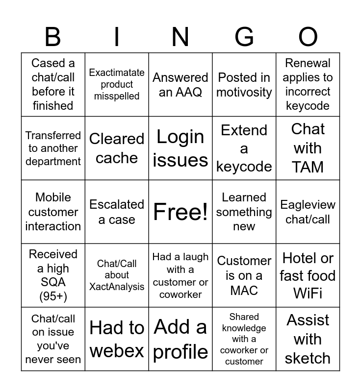 This bingo card has a free space and 31 words: Thanked by a customer, Had to webex, Login issues, Used a document, Renewal applies to incorrect keycode, Cased a chat/call before it finished, Escalated a case, Add a profile, Extend a keycode, Assist with sketch, Chat/call on issue you've never seen, Chat/Call about XactAnalysis, Shared knowledge with a coworker or customer, Received a positive CSAT, Received a high SQA (95+), Completed all casing for the day, Had a laugh with a customer or coworker, Learned something new, Eagleview chat/call, Customer attempts humor, Exactimatate product misspelled, ESX Question or Issue, Customer is on a MAC, Chat with TAM, Mobile customer interaction, Cleared cache, Answered an AAQ, Posted in motivosity, Hotel or fast food WiFi, Transferred to another department and Submitted feedback on behalf of customer.