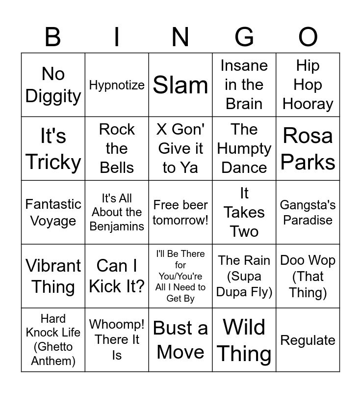 This bingo card has a free space and 48 words: So Fresh, So Clean, Regulate, Big Pimpin', Bust a Move, Can I Kick It?, I'll Be, Hypnotize, Rapper's Delight, It's Tricky, Ready or Not, Rock the Bells, Insane in the Brain, Doo Wop (That Thing), The Rain (Supa Dupa Fly), The Breaks, Shoop, X Gon' Give it to Ya, It Takes Two, Gravel Pit, Hip Hop Hooray, It's All About the Benjamins, Wild Thing, No Diggity, The Humpty Dance, California Love, Rosa Parks, Hard Knock Life (Ghetto Anthem), Feel Me Flow, I'll Be There for You/You're All I Need to Get By, Vibrant Thing, Dear Mama, Get Money, The Choice is Yours, Tootsee Roll, Whoomp! There It Is, Put Your Hands Where My Eyes Can See, Crush on You, Gangsta's Paradise, Nuthin' But a 'G' Thang, O.P.P., Feel So Good, Mama Said Knock You Out, Slam, Flava in Ya Ear Remix, Fantastic Voyage, The Message, Let Me Clear My Throat and Mo Money Mo Problems.