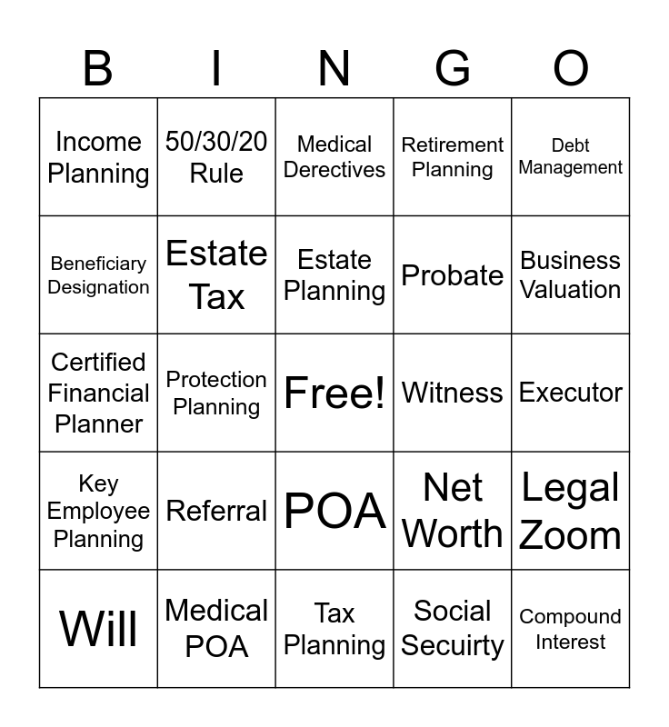 This bingo card has a free space and 29 words: Will, Cash Flow, Protection Planning, Investment Planning, Income Planning, Medical Derectives, Estate Tax, Referral, Witness, Medical POA, Executor, Compound Interest, Tax Planning, Social Secuirty, Business Valuation, Intestacy, POA, Key Employee Planning, Debt Management, Certified Financial Planner, Net Worth, Minors, Probate, Beneficiary Designation, Retirement Planning, 50/30/20 Rule, Legal Zoom, Estate Planning and Education Planning.