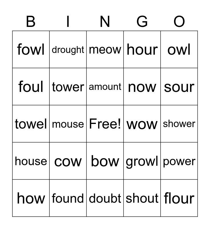 This bingo card has a free space and 25 words: cow, doubt, amount, how, owl, fowl, foul, drought, wow, bow, now, towel, growl, power, tower, flower, shower, meow, sour, mouse, flour, found, house, hour and shout.