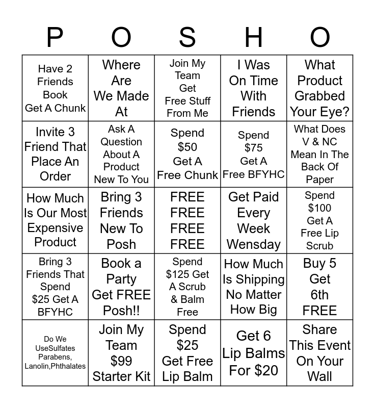 This bingo card has a free space and 24 words: Book a Party Get FREE Posh!!, Join My Team $99 Starter Kit, Spend $50 Get A Free Chunk, Do We UseSulfates Parabens, Lanolin,Phthalates, What Product Grabbed Your Eye?, Have 2 Friends Book Get A Chunk, Invite 3 Friend That Place An Order, Where Are We Made At, Get Paid Every Week Wensday, Spend $125 Get A Scrub & Balm Free, Spend $75 Get A Free BFYHC, How Much Is Our Most Expensive Product, How Much Is Shipping No Matter How Big, Buy 5 Get 6th FREE, Ask A Question About A Product New To You, Get 6 Lip Balms For $20, Spend $100 Get A Free Lip Scrub, Join My Team Get Free Stuff From Me, What Does V & NC Mean In The Back Of Paper, Bring 3 Friends New To Posh, Share This Event On Your Wall, Bring 3 Friends That Spend $25 Get A BFYHC, I Was On Time With Friends and Spend $25 Get Free Lip Balm.
