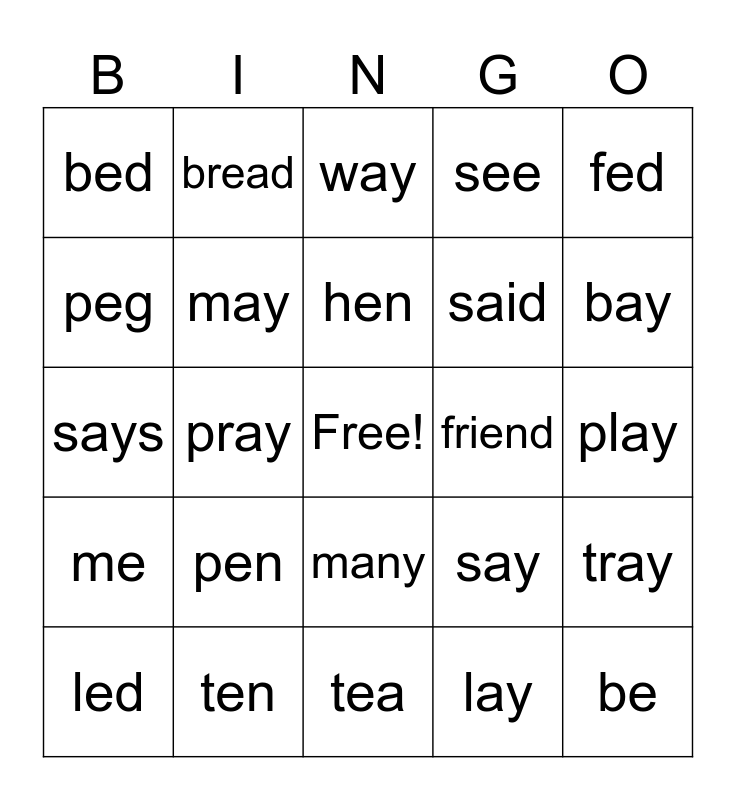 This bingo card has a free space and 24 words: pen, ten, hen, led, fed, bed, peg, bread, friend, many, said, says, say, tray, may, lay, play, way, bay, pray, be, me, see and tea.