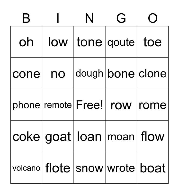 This bingo card has a free space and 25 words: goat, snow, dough, volcano, toe, oh, cone, low, row, loan, bone, phone, moan, flow, no, gnome, rome, tone, clone, remote, boat, flote, coke, qoute and wrote.