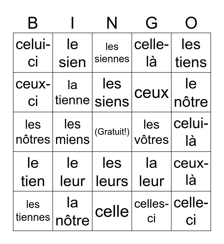 This bingo card has a free space and 33 words: le mien, la mienne, les miens, les miennes, le tien, la tienne, les tiens, les tiennes, le sien, la sienne, les siens, les siennes, le vôtre, la vôtre, les vôtres, le nôtre, la nôtre, les nôtres, le leur, la leur, les leurs, celui, celui-ci, celui-là, celle, celle-ci, celle-là, ceux, ceux-ci, ceux-là, celles, celles-ci and celles-là.