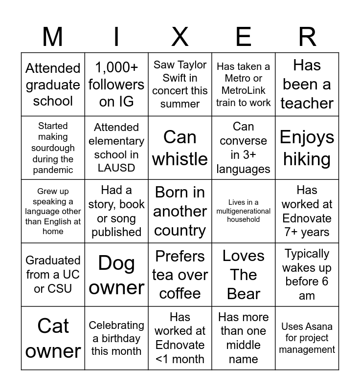 This bingo card has 25 words: Dog owner, Has worked at Ednovate <1 month, Can whistle, Cat owner, Has been a teacher, Attended graduate school, Started making sourdough during the pandemic, 1,000+ followers on IG, Lives in a multigenerational household, Prefers tea over coffee, Can converse in 3+ languages, Grew up speaking a language other than English at home, Loves The Bear, Typically wakes up before 6 am, Attended elementary school in LAUSD, Uses Asana for project management, Has worked at Ednovate 7+ years, Saw Taylor Swift in concert this summer, Enjoys hiking, Had a story, book or song published, Born in another country, Celebrating a birthday this month, Graduated from a UC or CSU, Has taken a Metro or MetroLink train to work and Has more than one middle name.