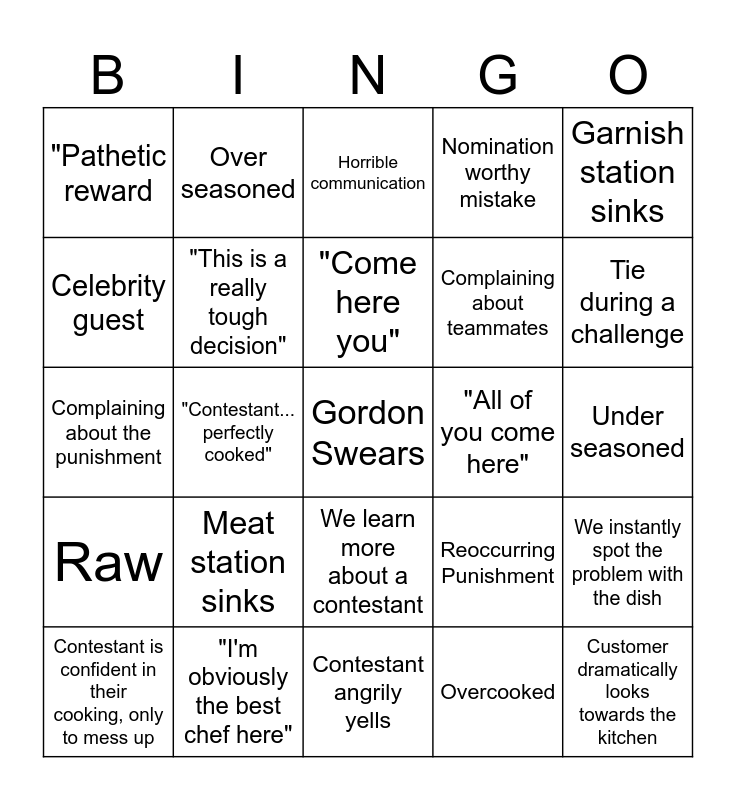 This bingo card has a free space and 34 words: Messes up the Risotto, Overcooked, Crying, Undercooked, Raw, "This is a really tough decision", Garnish station sinks, Contestant is confident in their cooking, only to mess up, Over seasoned, Gordon says a funny comment, "Come here you", Horrible communication, Team fights during service, One or two contestants sink the service, "All of you come here", Tie during a challenge, "I'm obviously the best chef here", Complaining about the punishment, Meat station sinks, Reoccurring Punishment, We learn more about a contestant, Contestant messes up during the last few minutes of a challenge, "Pathetic reward, Under seasoned, Contestant angrily yells, Customer dramatically looks towards the kitchen, Nomination worthy mistake, Contestant says something questionable, Complaining about teammates, Celebrity guest, *Waterphone sfx*, "Contestant... perfectly cooked", We instantly spot the problem with the dish and Contestant angrily yells.