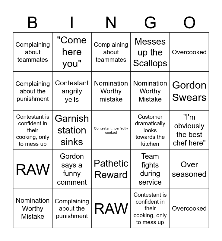 This bingo card has 49 words: Nomination Worthy Mistake, Contestant...perfectly cooked, Pathetic Reward, RAW, Gordon says a funny comment, Under seasoned, "Come here you", Contestant angrily yells, Complaining about the punishment, Contestant says something questionable, Contestant angrily yells, Messes up the Scallops, Over seasoned, Team fights during service, "I'm obviously the best chef here", Messes up the Risotto, Nomination Worthy mistake, Customer dramatically looks towards the kitchen, Celebrity guest, Overcooked, Garnish station sinks, Contestant is confident in their cooking, only to mess up, Complaining about teammates, Nomination Worthy Mistake, Contestant... perfectly cooked, Gordon Swears, Nomination Worthy Mistake, Contestant...perfectly cooked, Pathetic Reward, RAW, Gordon says a funny comment, Under seasoned, "Come here you", Contestant angrily yells, Complaining about the punishment, Contestant says something questionable, Messes up the Scallops, Team fights during service, "I'm obviously the best chef here", Messes up the Risotto Nomination Worthy mistake, Customer dramatically looks towards the kitchen, Celebrity guest, Overcooked, Garnish station sinks, Contestant is confident in their cooking, only to mess up, Complaining about teammates, Crying, *Waterphone sfx* and Horrible Communication.