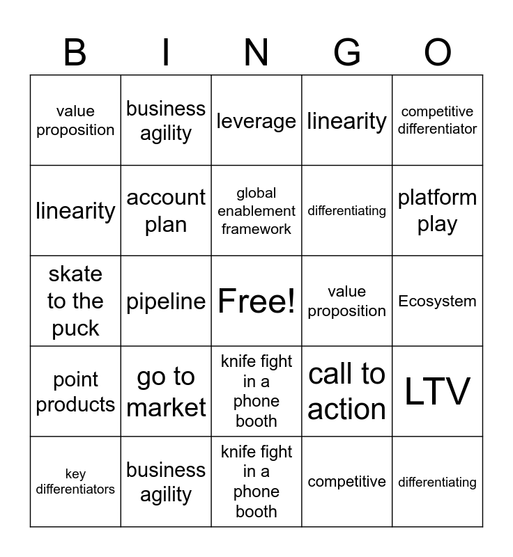 This bingo card has a free space and 68 words: go to market, differentiating, call to action, point products, FUD, value proposition, business agility, key differentiators, global enablement framework, LTV, knife fight in a phone booth, leverage, Ecosystem, competitive differentiator, strategic, linearity, pipeline, value proposition, key differentiators, go to market, differentiating, call to action, point products, FUD, value proposition, business agility, key differentiators, global enablement framework, LTV, knife fight in a phone booth, leverage, Ecosystem, competitive differentiator, strategic, linearity, pipeline, value proposition, key differentiators, platform play, skate to the puck, trusted advisor, business outcomes, account plan, executive engagement, go to market, call to action, point products, FUD, value proposition, business agility, key differentiators, global enablement framework, LTV, knife fight in a phone booth, leverage, Ecosystem, competitive, differentiator, strategic, linearity, pipeline, value proposition, platform play, skate to the puck, trusted advisor, business outcomes, account plan and executive engagement.