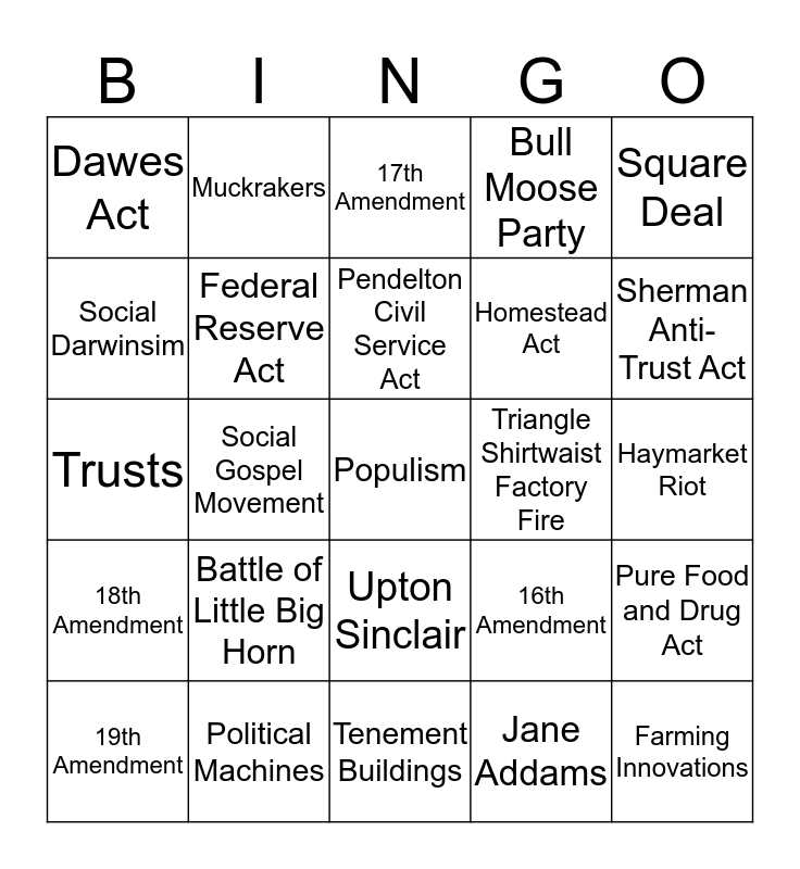 This bingo card has 25 words: Battle of Little Big Horn, Tenement Buildings, Pendelton Civil Service Act, 19th Amendment, Square Deal, Dawes Act, Social Darwinsim, Muckrakers, Triangle Shirtwaist Factory Fire, Upton Sinclair, Homestead Act, Trusts, 16th Amendment, Pure Food and Drug Act, Federal Reserve Act, Farming Innovations, Haymarket Riot, 17th Amendment, Sherman Anti-Trust Act, Social Gospel Movement, Populism, Political Machines, 18th Amendment, Bull Moose Party and Jane Addams.
