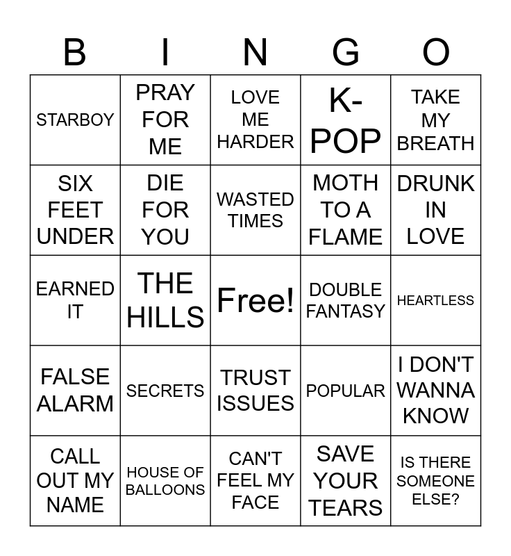 This bingo card has a free space and 31 words: CAN'T FEEL MY FACE, BLINDING LIGHTS, THE HILLS, I FEEL IT COMING, STARBOY, LOVE ME HARDER, DIE FOR YOU, POPULAR, DOUBLE FANTASY, SAVE YOUR TEARS, HEARTLESS, IS THERE SOMEONE ELSE?, WICKED GAMES, SACRIFICE, DRUNK IN LOVE, THE MORNING, I DON'T WANNA KNOW, SECRETS, FALSE ALARM, TRUST ISSUES, TAKE MY BREATH, DOUBLE FANTASY, CALL OUT MY NAME, PRAY FOR ME, MOTH TO A FLAME, SIX FEET UNDER, K-POP, EARNED IT, HOUSE OF BALLOONS, WASTED TIMES and A LONELY NIGHT.