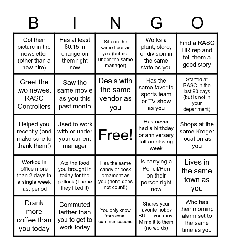 This bingo card has a free space and 24 words: Ate the food you brought in today for the potluck (I hope they liked it), Commuted farther than you to get to work today, Deals with the same vendor as you, Drank more coffee than you today, Find a RASC HR rep and tell them a good story, Got their picture in the newsletter (other than a new hire), Greet the two newest RASC Controllers, Has at least $0.15 in change on them right now, Has never had a birthday or anniversary fall on closing week, Has the same candy or desk ornament as you (none does not count!), Has the same favorite sports team or TV show as you, Helped you recently (and make sure to thank them!), Is carrying a Pencil/Pen on their person right now, Lives in the same town as you, Saw the same movie as you this past month, Shares your favorite hobby BUT... you must Mime it to them (no words), Shops at the same Kroger location as you, Sits on the same floor as you (but not under the same manager), Started at RASC in the last 90 days (but is not in your department), Used to work with or under your current manager, Who has their morning alarm set to the same time as you, Worked in office more than 2 days in a single week last period, Works a plant, store, or division in the same state as you and You only know from email communications.