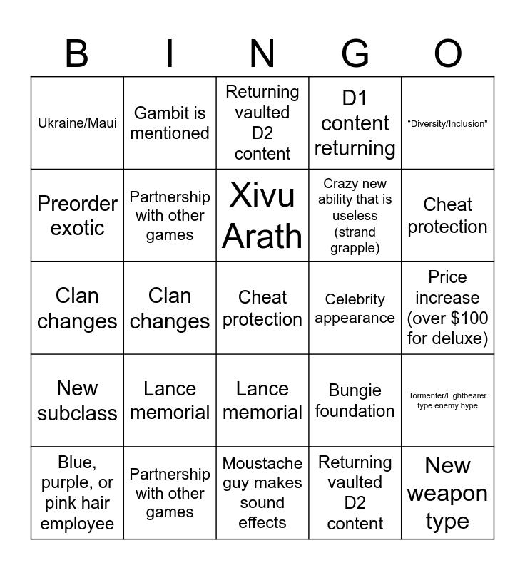 ⚠ This card has duplicate items: Cheat protection (2), Blue, purple, or pink hair employee (2), Moustache guy makes sound effects (2), Lance memorial (2), New subclass (2), Gambit is mentioned (2), Power level system change (2), Preorder exotic (2), Mention of community harassment (2), Partnership with other games (2), D1 content returning (2), Tormenter/Lightbearer type enemy hype (2), Bungie foundation (2), Price increase (over $100 for deluxe) (2), Crota raid returning (2), Xivu Arath (2), Celebrity appearance (2), New weapon type (2), “Diversity/Inclusion” (2), Clan changes (2), Returning vaulted D2 content (2), Ukraine/Maui (2), Crazy new ability that is useless (strand grapple) (2), Veil actually does something (2)