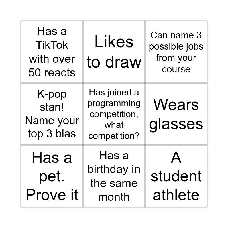 This bingo card has 19 words: Can speak 2 languages, Can name 5 programming languages, Can name 3 possible jobs from your course, Has been abroad. Prove it, IT/CS is not a first choice, name your dream course, Has joined a programming competition, what competition?, A student leader, what position?, Has a TikTok with over 50 reacts, Likes to draw, A student athlete, A dancer, Wears glasses, Has a pet. Prove it, Plays in a band, Has a strange talent, An anime fan, name your top 5 anime picks, K-pop stan! Name your top 3 bias, Has a birthday in the same month and Naka-organize na ang sched sa phone.