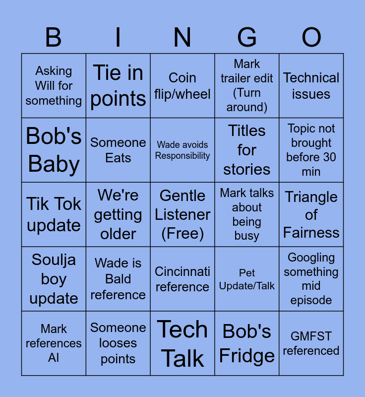 This bingo card has a free space and 29 words: Mark references AI, Handshake Deal, We're getting older, Subreddit reference, Asking Will for something, Coin flip/wheel, Someone Eats, Wade is Bald reference, Mark talks about being busy, Someone looses points, Triangle of Fairness, GMFST referenced, Tech Talk, Bob's Fridge, Topic not brought before 30 min, Someone gets up and leaves, Cincinnati reference, Soulja boy update, Technical issues, Tik Tok update, Pet Update/Talk, Ranking Things, Titles for stories, Bob's Baby, Mark trailer edit (Turn around), Tie in points, Googling something mid episode, Wade avoids Responsibility and Repeat Topic.