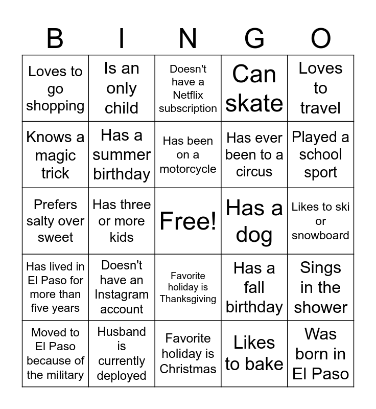 This bingo card has a free space and 53 words: Is afraid of heights, Was born in El Paso, Has met someone famous, Likes to bake, Doesn't have an Instagram account, Has a cat, Is an only child, Is left-handed, Knows a magic trick, Has twins in your family, Has a summer birthday, Likes to go camping, Sings in the shower, Has a fall birthday, Enjoys video games, Moved to El Paso because of the military, Has been on a motorcycle, Has a dog, Likes spicy food, Loves to travel, Has three or more kids, Has been to more than four states, Has ever been to a circus, Loves to go shopping, Doesn't have any pets, Husband is currently deployed, Is an introvert, Hates math, Likes to sing karaoke, Played a school sport, Can play an instrument, Wears glasses, Has broken a bone, Is the oldest sibling, Has a spring birthday, Has been to more than two countries, Can skate, Favorite holiday is Christmas, Doesn't have a Netflix subscription, Has a winter birthday, Is the youngest sibling, Loves chocolate, Likes to ski or snowboard, Is an extrovert, Has been on a cruise, Favorite holiday is Thanksgiving, Loves the beach, Has never had a cavity, Prefers salty over sweet, Has lived in El Paso for more than five years, Has/had braces, Likes to Run and Speaks two or more languages.