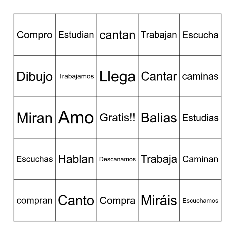 This bingo card has a free space and 34 words: Hablo, Miráis, Estudiamos, Miro, Escuchas, Trabajamos, Escucha, compran, Estudian, Descansan, Llega, cantan, Habla, Llegamos, Balias, caminas, Canto, Miran, Hablan, Trabaja, Descanamos, Miramos, Compro, Estudias, Compra, Escuchamos, Trabajan, Viajo, Cantar, Dibujo, Cena, Amo, Caminan and Dibuja.