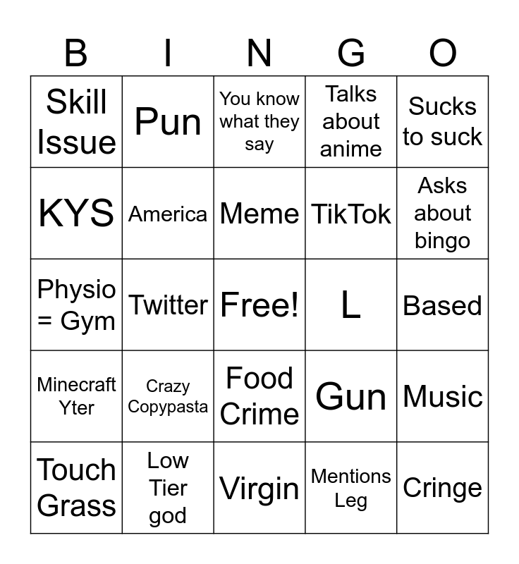 This bingo card has a free space and 24 words: Crazy Copypasta, Low Tier god, Meme, Touch Grass, Sucks to suck, Skill Issue, KYS, Pun, L, Food Crime, TikTok, Physio = Gym, Gun, Music, America, Mentions Leg, Based, You know what they say, Asks about bingo, Twitter, Cringe, Minecraft Yter, Talks about anime and Virgin.