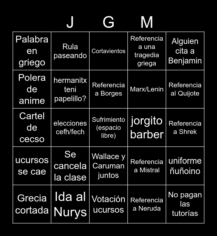 This bingo card has a free space and 104 words: Danto (No molestar), Alguien cita a Foucault, Alguien cita a Benjamin, "Más que una pregunta es una observación...", Funado, Alguien con cortaviento, Gente vendiendo comida, Comida vegana, "Hay que irse a paro", Álvarez en depresión, Rumores de paro/toma, Minita aesthetic con waren con cigarro, gente volá en calama, "Prende calama?", Asamblea, Baños sin confort, Cortavientos, "el capitalismo...", Alguien cita a Butler, Poema de Mistral, bandera gay, bandera trans, gente aesthetic, Alguien cita a Bajtín, Llaman a tio computador, Se cancela la clase, Referencia al Quijote, Referencia a una tragedia griega, Referencia a la Iliada/Odisea/Eneida, Referencia a la Araucana, Referencia a Mistral, Referencia a Neruda, Palabra en alemán, Palabra en latín, Homoerotismo, Referencia a Kafka, Referencia a Lorca, Les preguntan por la tesis fuera de seminario, Referencia a Borges, Ida al Nurys, Canción de Taylor Swift en parlante, ucursos se cae, ucampus se cae, Polera de anime, Al profe le suena el teléfono en clases, Palabra en griego, No pagan las ayudantías, No pagan las tutorías, Pregado se manda un cagazo, Gente jugando taka taka, Gente bailando k-pop, Gente tejiendo, Marcha, "Lo hacemos online", Piden fuego, Gente de cine con cámaras, Alguien llega atrasadx, "Santiaguinos culiaos", Gente corriendo de dos gotas de lluvia, Wallace y Caruman juntos, Referencia a Shrek, Referencia al Rey Arturo, Mencionan a Hildegard de Bingen, Paco y Jessica juntos, Gente vendiendo ropa, Gente vendiendo libros, "Tomémonos la U", Rula paseando, Cartel de cecso, elecciones cefh/fech, Votación ucursos, Basura en Calama, "¿Has visto a esta vaca?", chiste funable, "La lucha continua", Profe se enferma, domesticos en grecia, Grecia cortada, lienzo nuevo, Pintatón, Profe te invita a seminario (no vas), A x el G, hermanitx teni papelillo?, venta de tabaco, jorgito barber, gente grabando tiktoks, weon con guitarra, cokita, chisme en el ascensor, avance en la tesis, mochila con chapitas de anime, cosas del miniso, tequilazo, uniforme ñuñoino, Gente jugando ping pong, Ana Baeza pegándose el show, Memertinez, Marx/Lenin, cristianismo, al anto le pasa una desgracia, el boris, vale x boris, weon vendiendo papayas and ciclo de cine.
