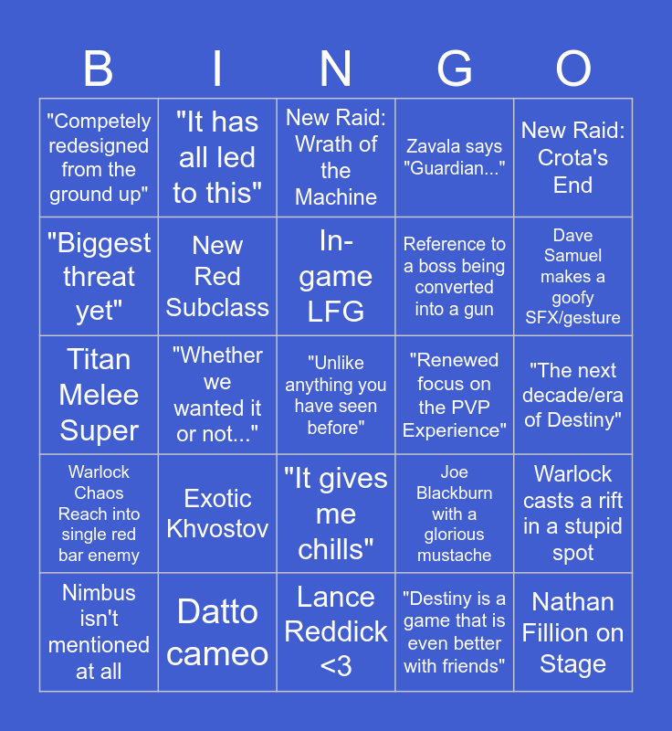 This bingo card has 25 words: Exotic Khvostov, Lance Reddick <3, In-game LFG, Nimbus isn't mentioned at all, New Raid: Crota's End, "Competely redesigned from the ground up", "Biggest threat yet", "It has all led to this", "Renewed focus on the PVP Experience", "It gives me chills", Reference to a boss being converted into a gun, Titan Melee Super, Joe Blackburn with a glorious mustache, Warlock casts a rift in a stupid spot, New Red Subclass, Nathan Fillion on Stage, "The next decade/era of Destiny", New Raid: Wrath of the Machine, Dave Samuel makes a goofy SFX/gesture, "Whether we wanted it or not...", "Unlike anything you have seen before", Datto cameo, Warlock Chaos Reach into single red bar enemy, Zavala says "Guardian..." and "Destiny is a game that is even better with friends".