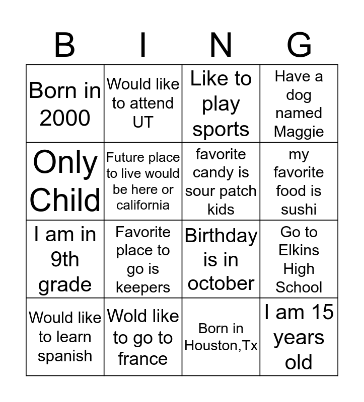 This bingo card has a free space and 15 words: Would like to learn spanish, I am 15 years old, Like to play sports, Born in 2000, my favorite food is sushi, Only Child, Favorite place to go is keepers, Born in Houston,Tx, Future place to live would be here or california, I am in 9th grade, Go to Elkins High School, Have a dog named Maggie, favorite candy is sour patch kids, Would like to attend UT and Wold like to go to france.