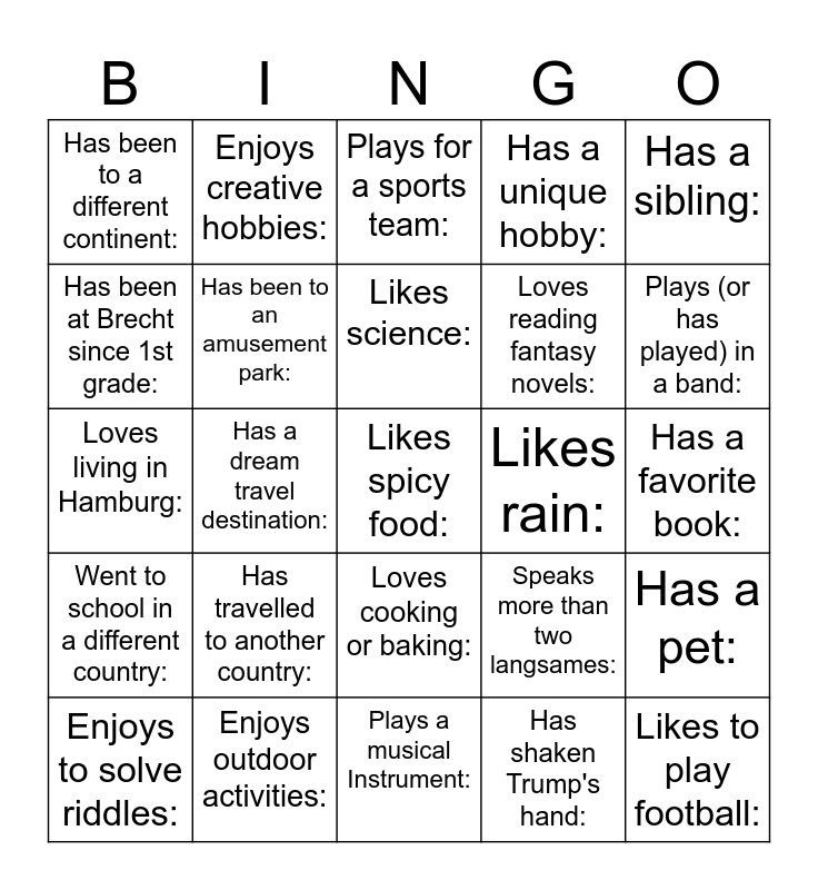 This bingo card has 25 words: Has travelled to another country:, Plays a musical Instrument:, Likes science:, Enjoys to solve riddles:, Has a sibling:, Has been to a different continent:, Has been at Brecht since 1st grade:, Enjoys creative hobbies:, Likes rain:, Loves cooking or baking:, Loves reading fantasy novels:, Loves living in Hamburg:, Speaks more than two langsames:, Has a pet:, Has been to an amusement park:, Likes to play football:, Has a favorite book:, Plays for a sports team:, Plays (or has played) in a band:, Has a dream travel destination:, Likes spicy food:, Enjoys outdoor activities:, Went to school in a different country:, Has a unique hobby: and Has shaken Trump's hand:.