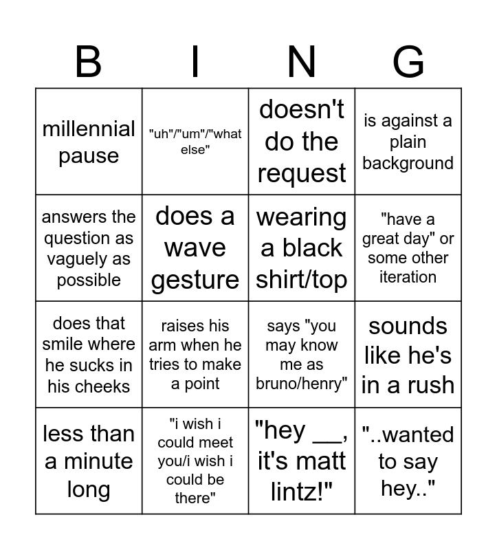 This bingo card has 16 words: less than a minute long, "i wish i could meet you/i wish i could be there", doesn't do the request, is against a plain background, answers the question as vaguely as possible, "uh"/"um"/"what else", says "you may know me as bruno/henry", sounds like he's in a rush, millennial pause, does a wave gesture, "hey __, it's matt lintz!", "have a great day" or some other iteration, does that smile where he sucks in his cheeks, raises his arm when he tries to make a point, wearing a black shirt/top and "..wanted to say hey..".