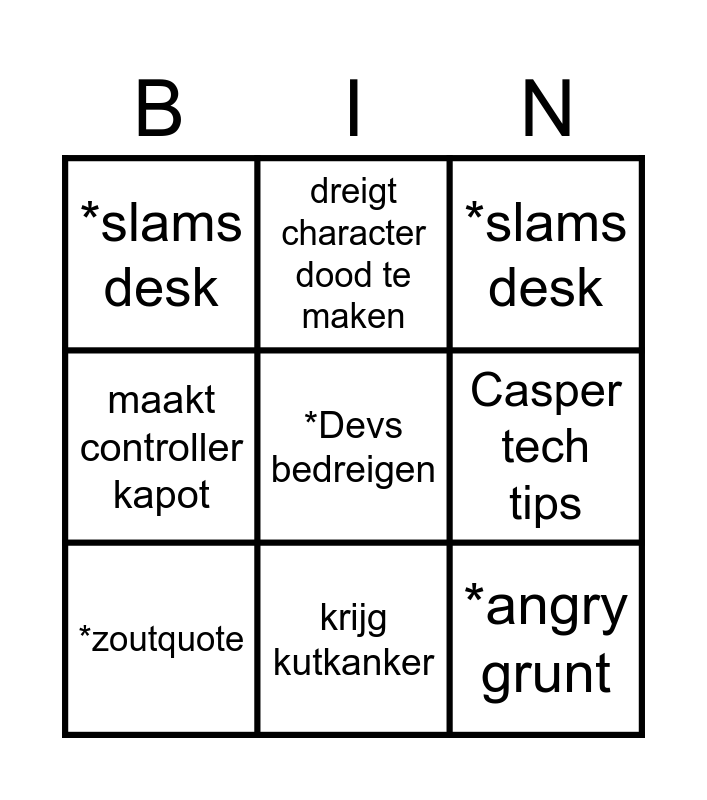 This bingo card has a free space and 11 words: GODVERDEKUTKANKER, krijg kutkanker, *angry grunt, *zoutquote, dreigt character dood te maken, *slams desk, Casper tech tips, Kanker/kutspel, maakt controller kapot, *slams desk and Mcfrothbeard imitatie.