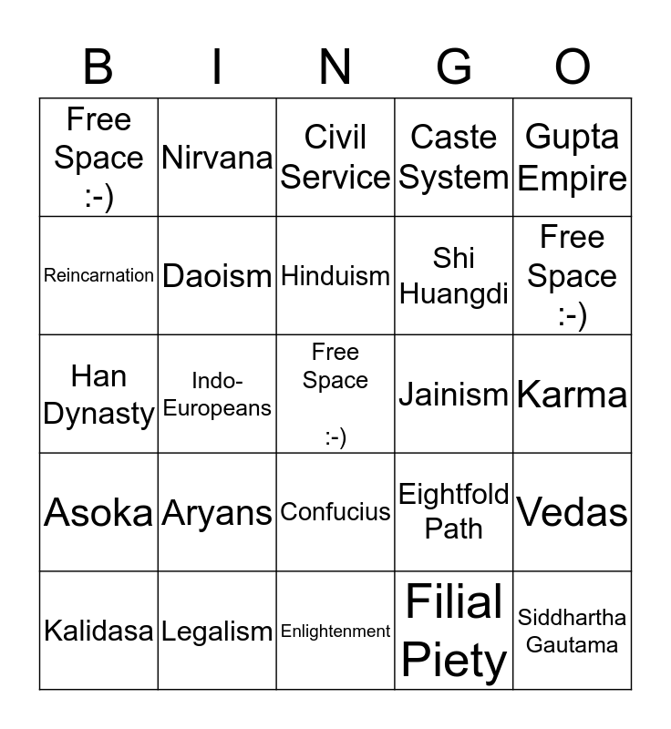 This bingo card has a free space and 24 words: Aryans, Legalism, Hinduism, Kalidasa, Gupta Empire, Free Space :-), Reincarnation, Nirvana, Jainism, Confucius, Shi Huangdi, Han Dynasty, Eightfold Path, Vedas, Daoism, Filial Piety, Karma, Civil Service, Free Space :-), Indo-Europeans, Siddhartha Gautama, Asoka, Caste System and Enlightenment.