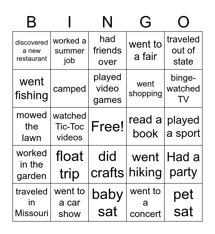 This bingo card has a free space and 34 words: visited family, went to a concert, went swimming, rode bikes, worked in the garden, camped, traveled out of state, traveled in Missouri, worked a summer job, rode horses, played video games, had friends over, sleep over at a friend's house, painted bedroom, read a book, binge-watched TV, went to a car show, mowed the lawn, float trip, went hiking, did crafts, rode a roller coaster, discovered a new restaurant, played a sport, baby sat, pet sat, went to a fair, went to a drive-in movie, went shopping, went fishing, wrote in a journal, watched Tic-Toc videos, Had a party and went on a picnic.