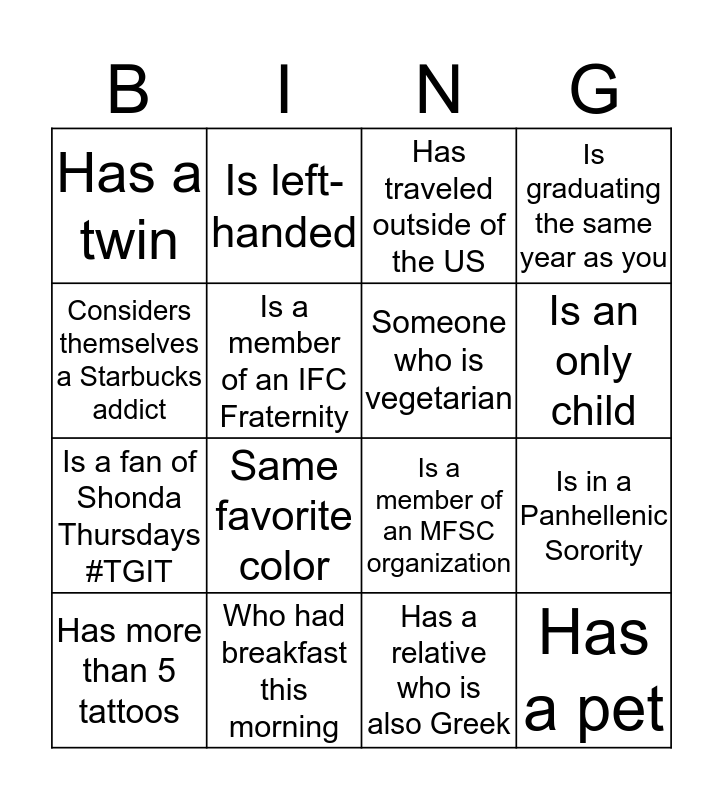 This bingo card has a free space and 15 words: Has more than 5 tattoos, Has a pet, Has traveled outside of the US, Has a twin, Is an only child, Considers themselves a Starbucks addict, Same favorite color, Has a relative who is also Greek, Is a member of an IFC Fraternity, Is a fan of Shonda Thursdays #TGIT, Is in a Panhellenic Sorority, Is graduating the same year as you, Someone who is vegetarian, Is left-handed and Who had breakfast this morning.
