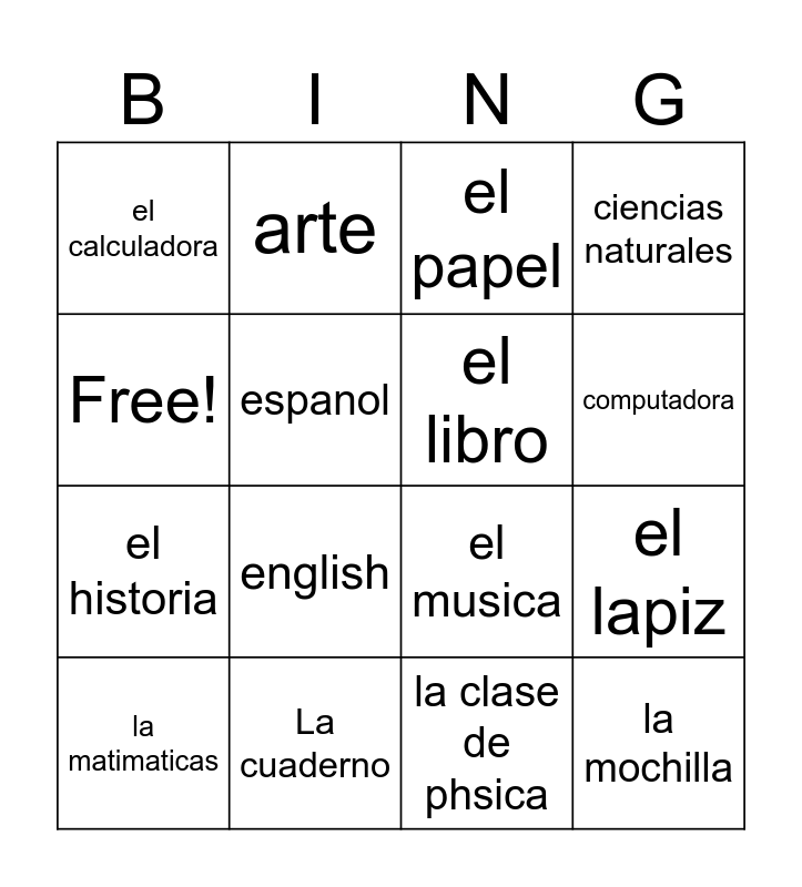 This bingo card has 16 words: La cuaderno, el lapiz, el papel, el calculadora, el historia, arte, el musica, la clase de phsica, Free!, espanol, la matimaticas, ciencias naturales, english, computadora, el libro and la mochilla.