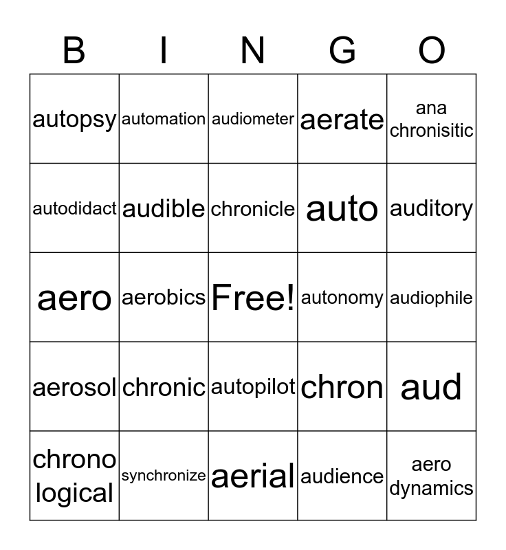 This bingo card has a free space and 24 words: chronic, synchronize, chronicle, chrono logical, ana chronisitic, autopsy, autodidact, automation, autonomy, autopilot, auto, aero, chron, aud, audible, audience, audiophile, audiometer, auditory, aerobics, aero dynamics, aerosol, aerate and aerial.