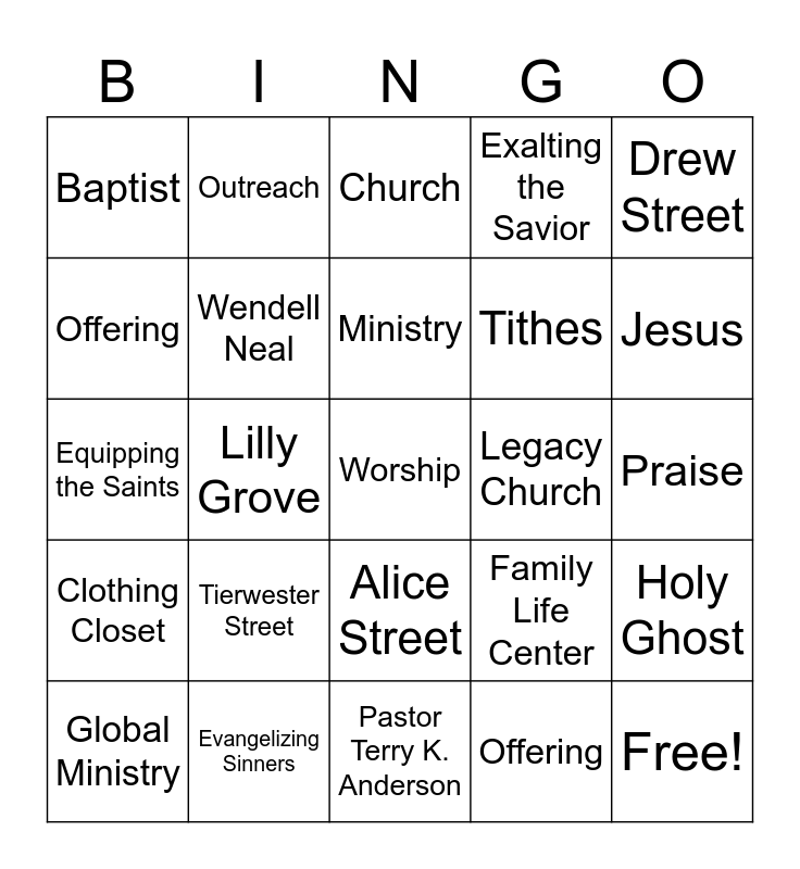 This bingo card has 31 words: Pastor Terry K. Anderson, Rev. Carlos Washington, Lilly Grove, Missionary, Baptist, Church, Wendell Neal, Family Life Center, Legacy Church, Offering, Praise, Worship, Free!, Main Sanctuary, Jesus, God, Holy Ghost, Tierwester Street, Clothing Closet, Alice Street, Drew Street, Idaho Street, Global Ministry, Outreach, Tithes, Offering, Exalting the Savior, Equipping the Saints, Evangelizing Sinners, Ministry and Fellowship.